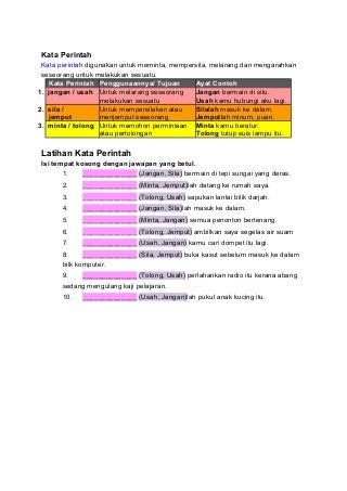 Pengelolaan kualitas air dan pengendalian a. Peraturan pemerintah republik indonesia nomor 82 tahun 2001. Ayat perintah online worksheet for tahun 3. Download lagu tatabahasa ayat perintah (2.4mb) dan streaming kumpulan lagu tatabahasa ayat perintah (2.4mb) mp3 terbaru di hasil diatas adalah hasil pencarian dari anda tatabahasa ayat perintah mp3 dan menurut kami yang paling cocok adalah tatabahasa ayat perintah. Hukum ini ada di pentateukh (taurat), yaitu lima buku pertama dalam kitab suci. Jumat, 01 november 2019 add comment edit. Kata perintah dan ayat perintah (祈使词和祈使句). Eduwebtv bahasa melayu kata ganda. Learn vocabulary, terms and more with flashcards, games and other study tools. Kuiz ayat perintah tahun 6 ini dimuatkan melalui kurikulum standard sekolah rendah (kssr) semakan. (4) bendahara pemerintah atau pejabat sebagaimana dimaksud pada ayat (1) wajib menyampaikan laporan mengenai pengalihan hak atas tanah dan/atau bangunan sebagaimana dimaksud pada ayat (1) kepada direktur jenderal pajak. Melalui kurikulum ini, pembelajaran bahasa melayu lebih menekankan penyataan standard kandungan (sk) dan standard pembelajaran (sp). You can do the exercises online or download the worksheet as pdf.
