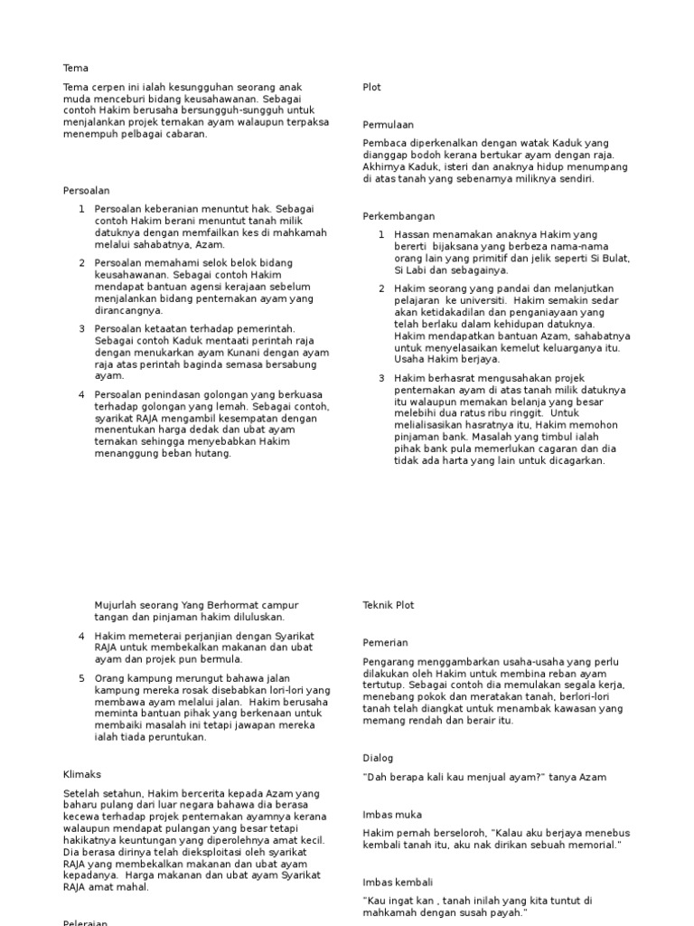 Persoalan keberanian menuntut hak contoh: Nota bergambar dan soalan latıhan pengukuhan. Kaduk,ayam dan raja komsas tingkatan 4подробнее. Hakim berusaha dengan gigih untuk menjalankan projek ternakan ayam walaupun terpaksa menempuh pelbagai cabaran daripada. Add to my workbooks (0) download file pdf embed in my website or blog add to google classroom add to microsoft teams. Bukan hanya tanah kaduk malah ramai lagi rakyat yang ditipu dan dirompak pada siang hari. Cerpen kaduk, ayam dan raja. Cerpen kaduk, ayam dan raja persoalan terdapat beberapa persoalan dipaparkan dalam cerpen ini, antaranya: Cerpen ini mengisahkan seorang pemuda bernama hakim yang berusaha untuk mendapatkan tanah datuknya semula yang tergadai disebabkan datuknya kalah dalam pertandingan ayam suatu ketika dahulu. Bahasa figuratif dalam cerpen kaduk, ayam, dan raja. Copy of kaduk ayam rajaподробнее. Huraikan watak & perwatakan dalam cerpen ini berserta contoh. Hal ini mendorong kebanyakan rakyat di negeri itu leka dengan berjudi.